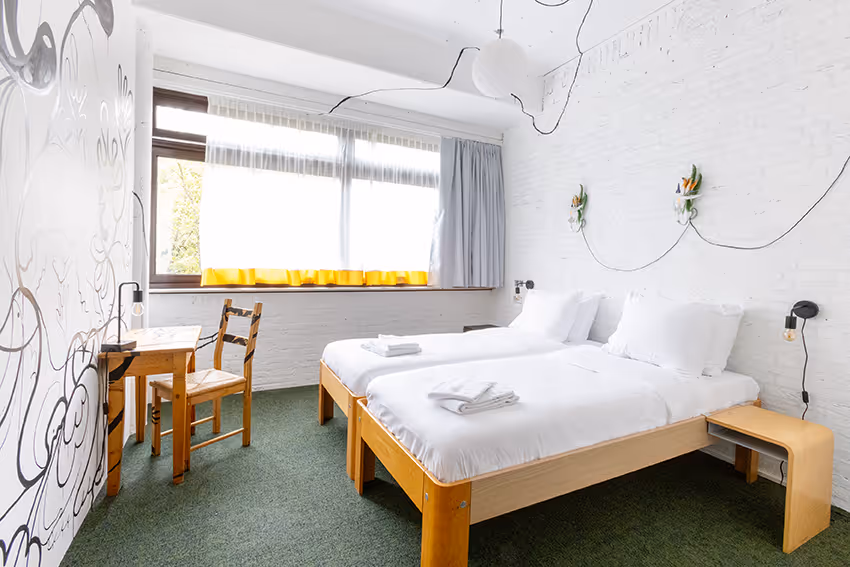 Blijven slapen bij De Groene Afslag is anders-dan-anders. Elke kamer is uniek, ontworpen door kunstenaars, gebouwd van restmateriaal, gevuld met verhalen. Geen zorgen, in iedere kamer staat een heerlijk Auping bed en lig je dus even lekker.