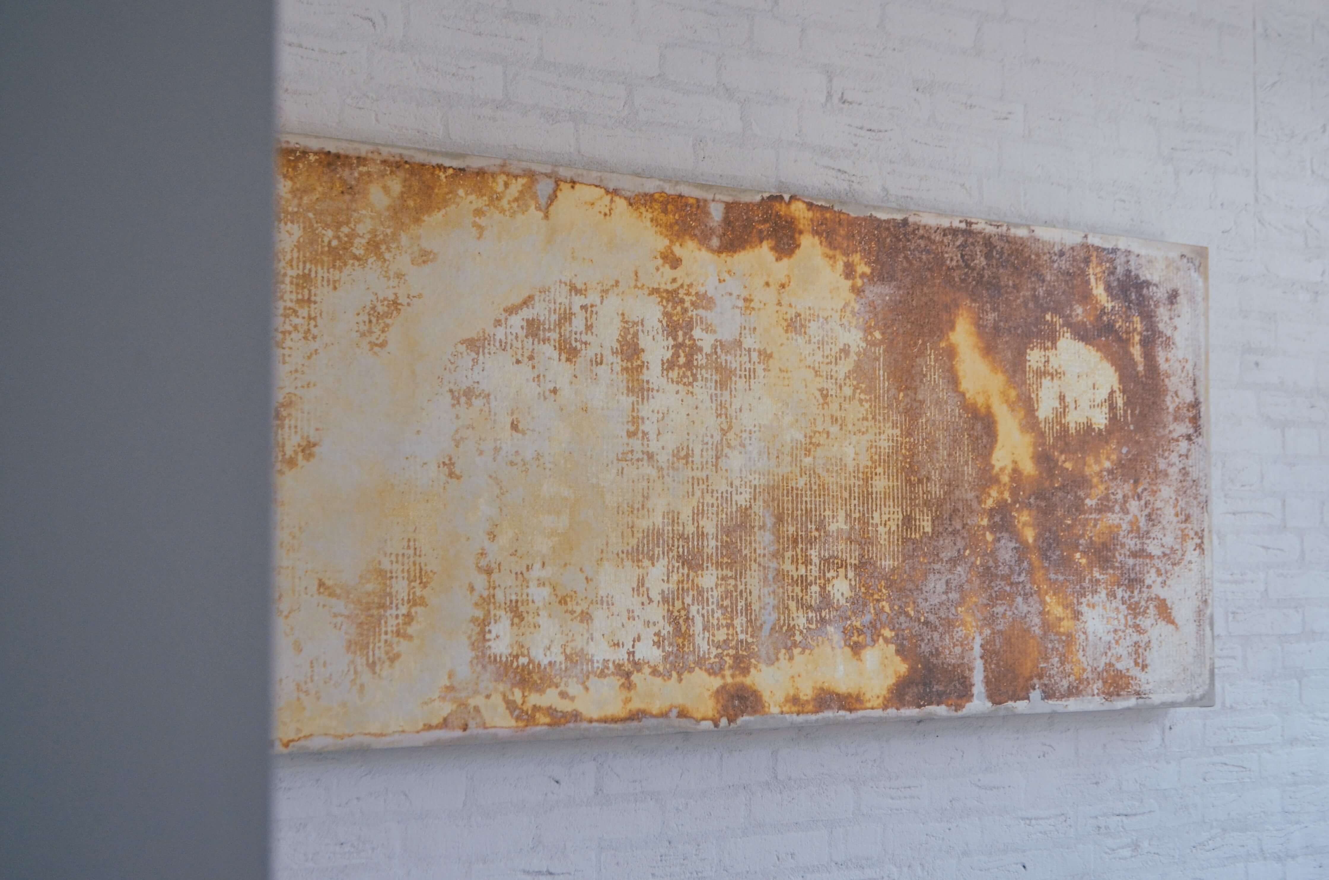 In de kamer hangen twee panelen, elk gemaakt door een ander biologisch rijk: de schimmels en de planten. Hun vormen en patronen verschillen, maar ze delen een boodschap van verbinding en groei. Het opwaarts groeiende mycelium beeld herinnert ons eraan dat we omringd zijn door levende wezens die vaak onopgemerkt blijven. De lampen benadrukken met licht de textuur van het gegroeide oppervlak.