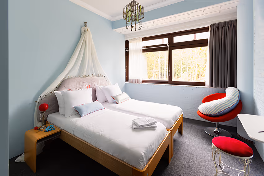 Door de dag heen vangt het zonlicht de zilveren lepels en tovert het dansende reflecties op de zachtblauwe muren. En 's nachts? Lig je natuurlijk lepeltje lepeltje! Samen, of met een heerlijk spoon-kussen voor wie alleen slaapt. Hier word je niet alleen uitgeslapen wakker, maar ook een beetje gelukkiger. Een nacht doorbrengen in The Spoon Room is een wonderlijk avontuur met een zilveren randje.
