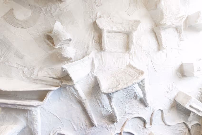 Om je heen zie je afdrukken van meubels uit het verleden. Gemaakt met textiel, verzameld door de moeder van de maker. Een tafel en een stoel hangen los in de ruimte; als herinneringen, zonder vaste grond in het heden. Alles verwijst naar kamers die er niet meer zijn - net iets verschoven van hoe het ooit was.