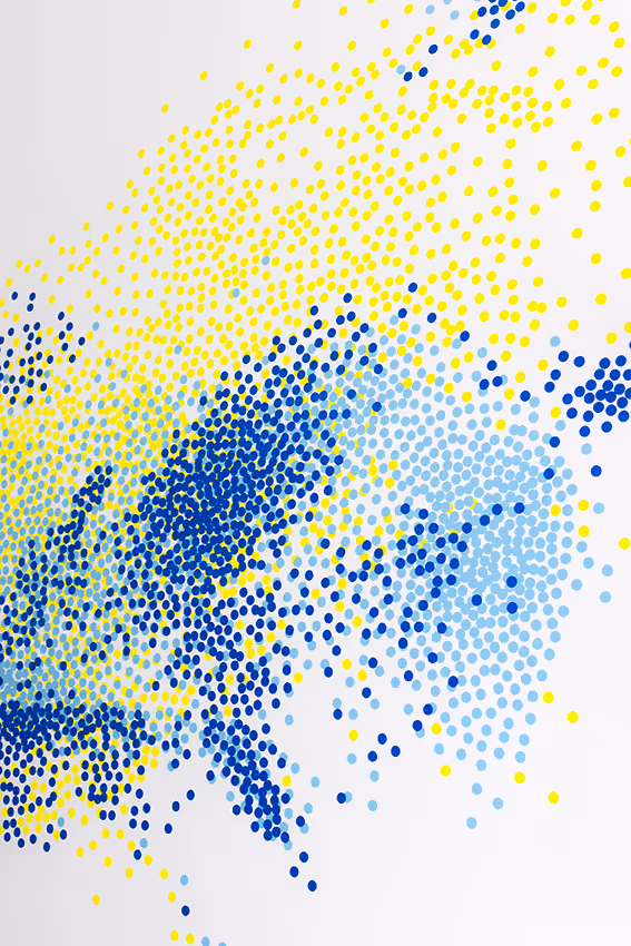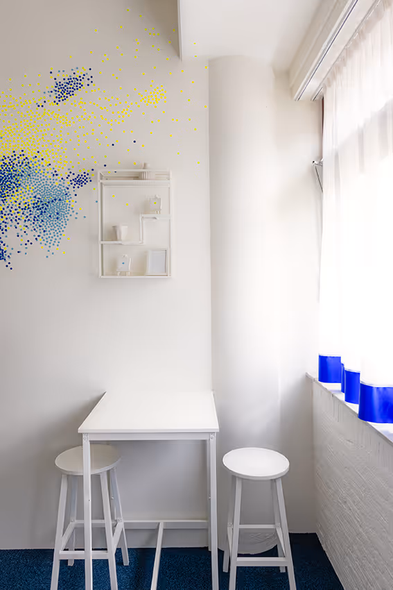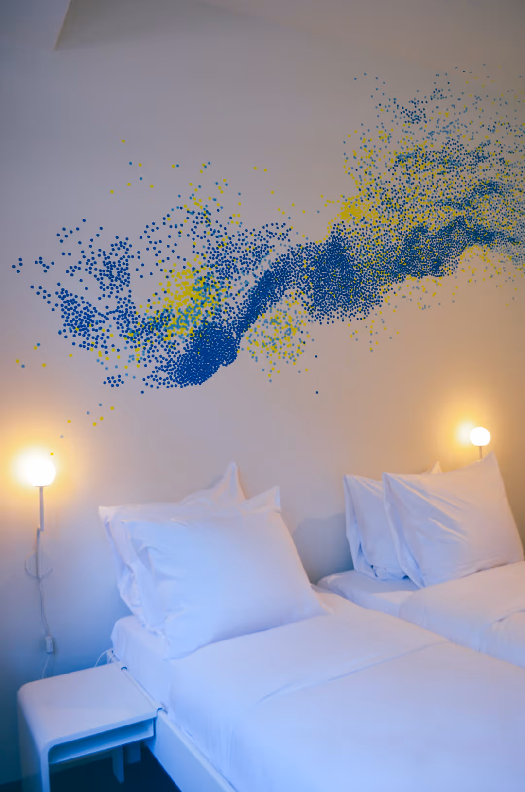 Wat dit werk bijzonder maakt, is de interactie met de bezoeker. Iedereen die in de kamer overnacht, krijgt één sticker om zelf aan het kunstwerk toe te voegen. Op deze manier groeit het werk gestaag door - elke sticker een spoor van aanwezigheid, elke toevoeging een klein nieuw verhaal. Het resultaat is een voortdurend veranderende installatie waarin ruimte, tijd en publiek samenkomen.
