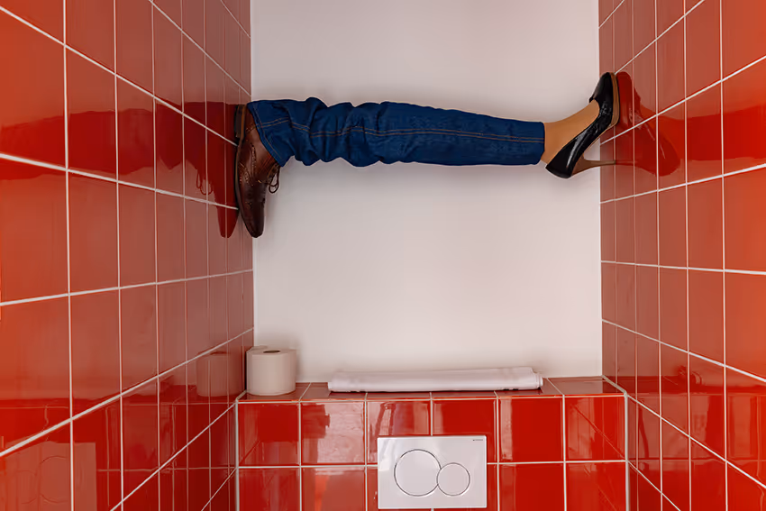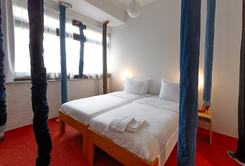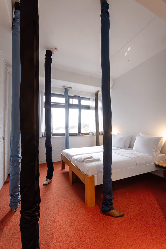 Voor De Groene Afslag ontwierp Peters een ‘walk-in forest’: een woud van spijkerbroeken dat tussen vloer en plafond is geklemd. Een poëtisch tegenbeeld van de walk-in closet, geen toonzaal van bezit, maar een ruimte om te vertragen, te voelen en opnieuw te kijken.