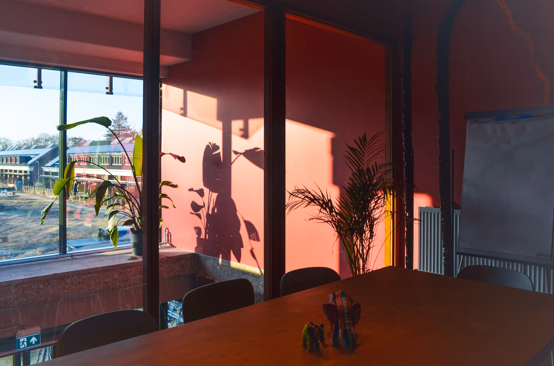 Een klein maar fijne ruimte in het hart van De Groene Afslag, voorzien van een groot beeldscherm waar je een laptop makkelijk op aansluit. Perfect geschikt voor kleinere groepen van max. 8 personen, één op één sessies of als break-out room. De Roze Bril zit op de eerste verdieping van De Groene Afslag, met uitzicht over de bomen.